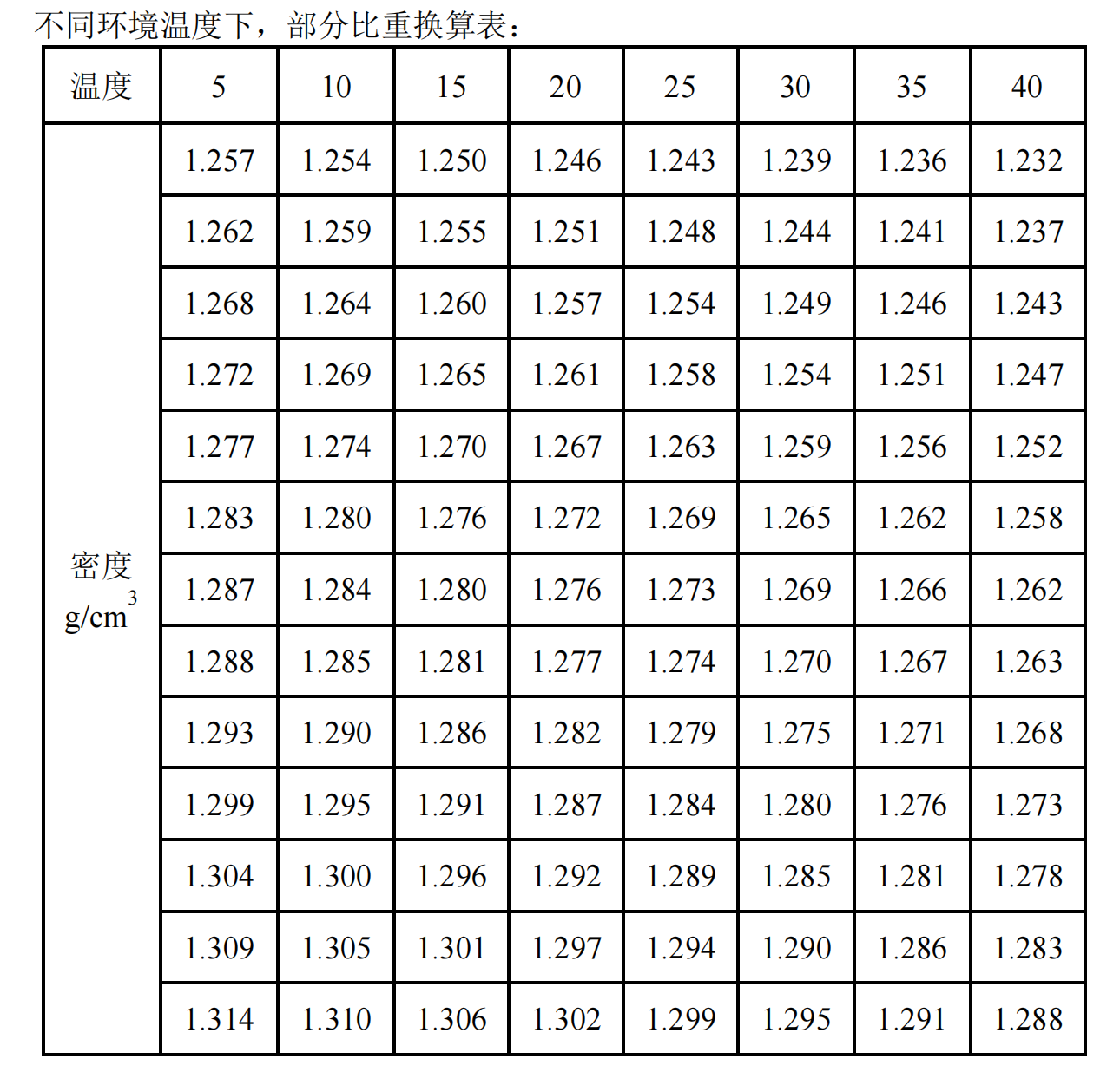 2) 比重計(jì)中浮子上的刻度表以三種顏色區(qū)域和刻度來表示: